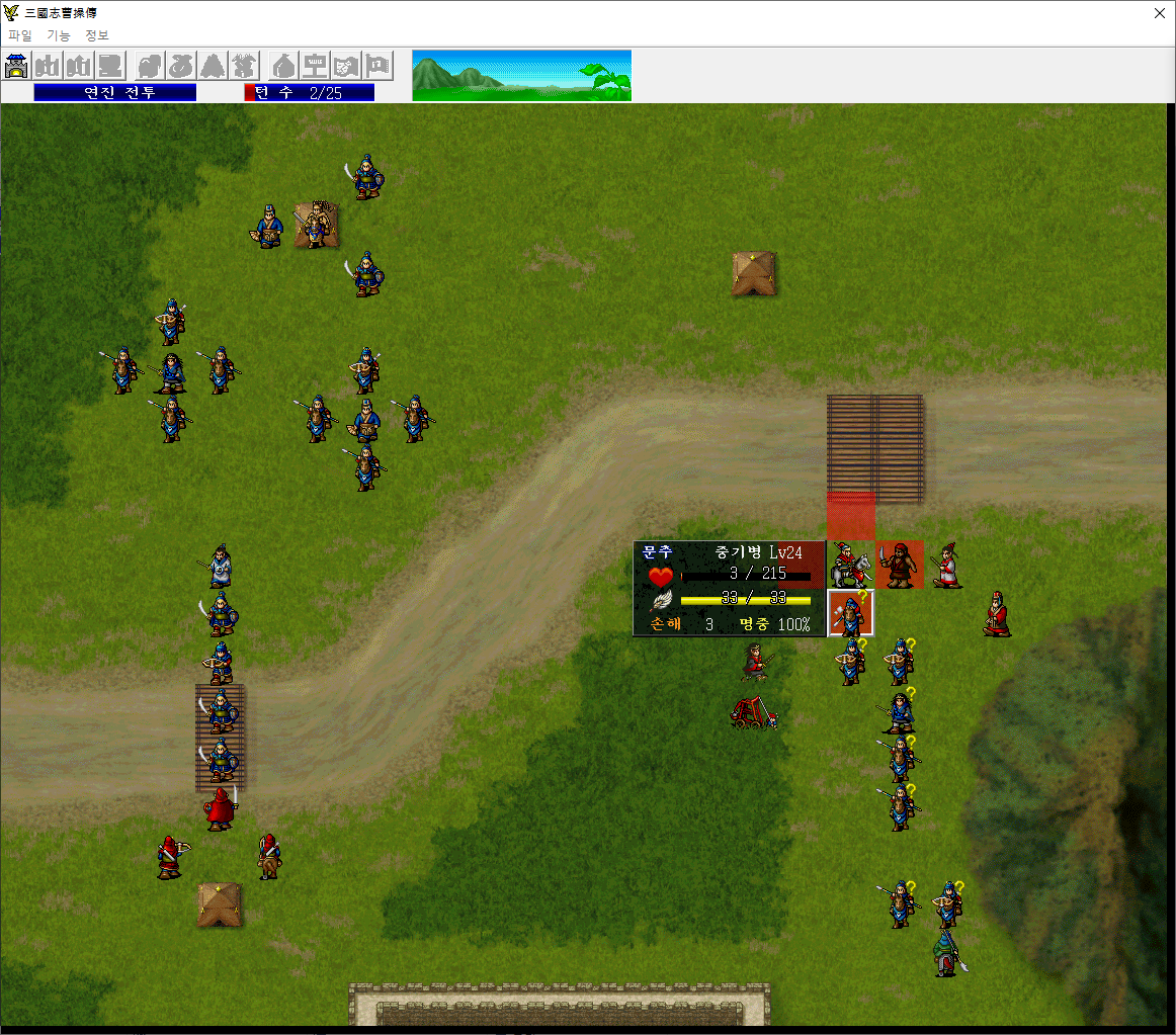 시작하면 조조가 계략을 세워두고 선택지가 나오는데 1번을 선택하면 역시 관우가 문추를 썰어버리므로 경험치 손실이 생기니 2번으로 진행한다.