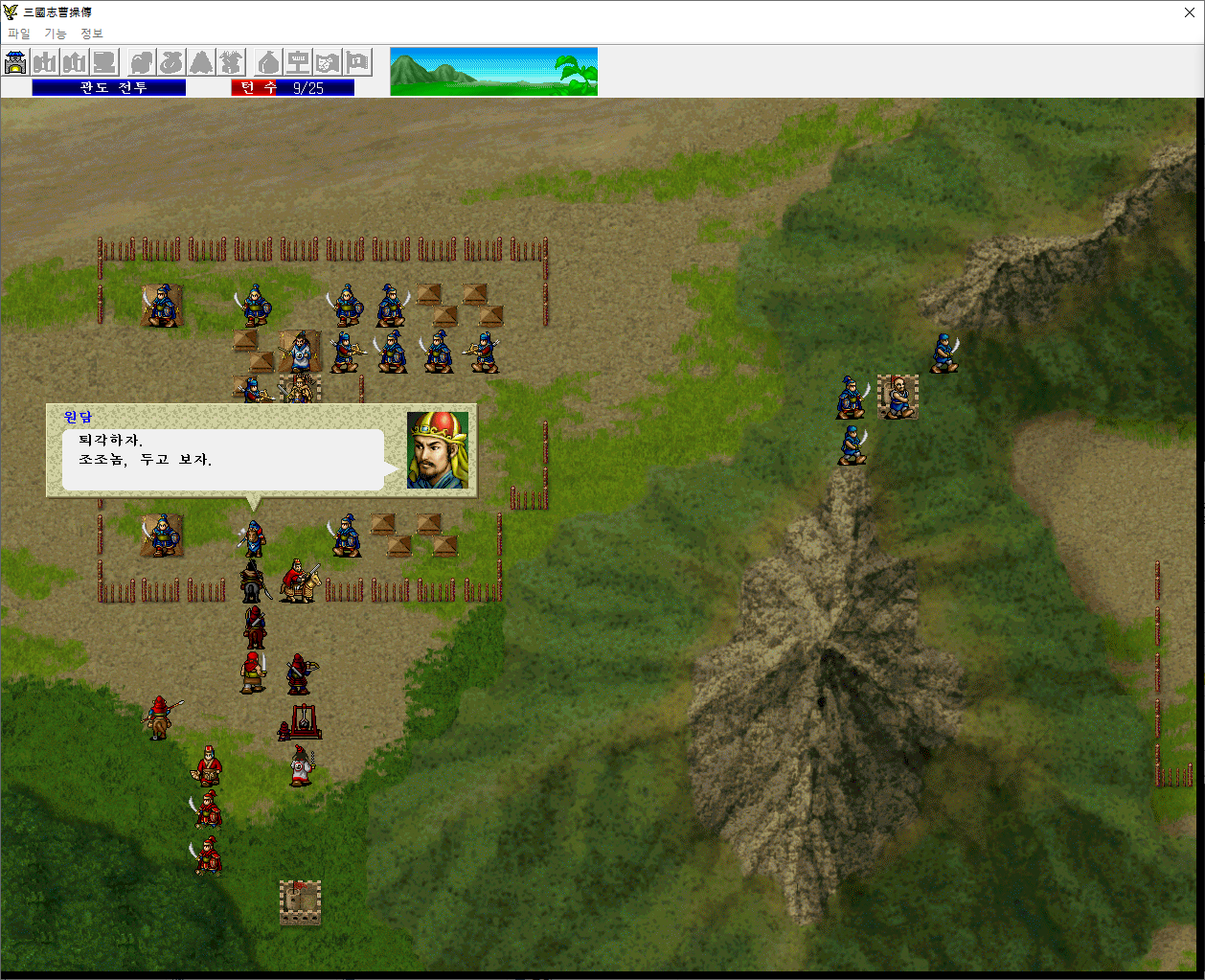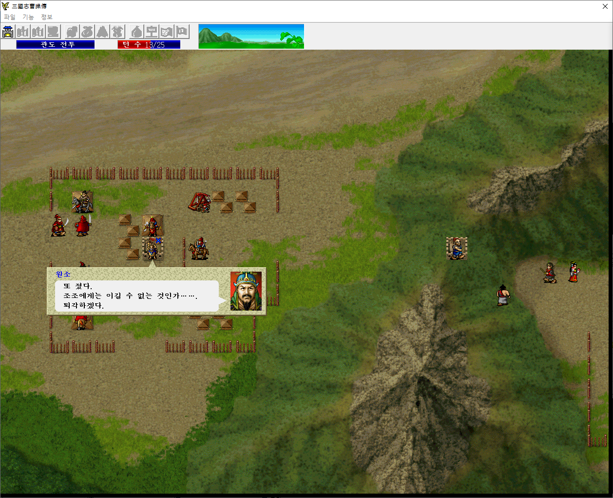 원소군은 아군 3턴 턴종시부터 내려오기 시작한다. 전위, 초선, 도사를 오소쪽으로 보내고 본대는 버프를 걸어두자